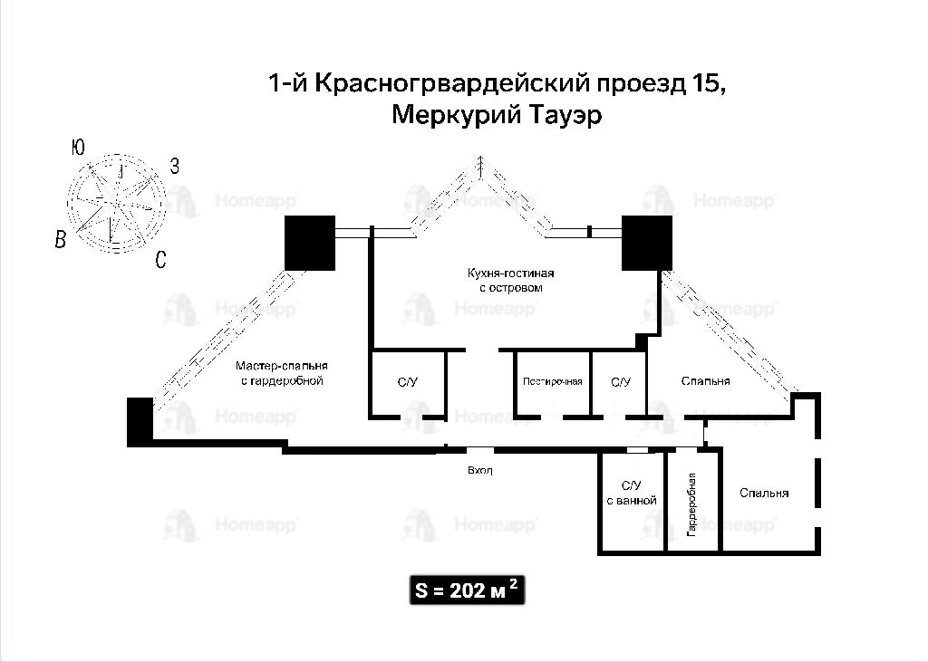 Планировка: кухня-гостиная с островом для приготовления, 3 спальни (в том числе мастер-спальня с гардеробной зоной и комнатой для make-up), 3 санузла (один с ванной), постирочная, просторный холл и общая гардеробная/кладовая. Мастер-спальня и остальные комнаты расположены в разных крыльях квартиры, что обеспечивает максимальный комфорт проживания с детьми. Из панорамных окон с юго-восточной до северо-западной стороны света открывается вид сразу на 3 сталинские высотки: МИД, Radisson Collection и МГУ, на водную гладь Москва-реки, зелень Лужников и архитектурное сияние башен "Москва-Сити".